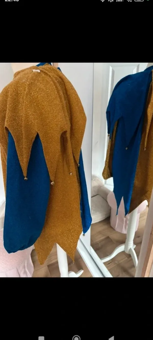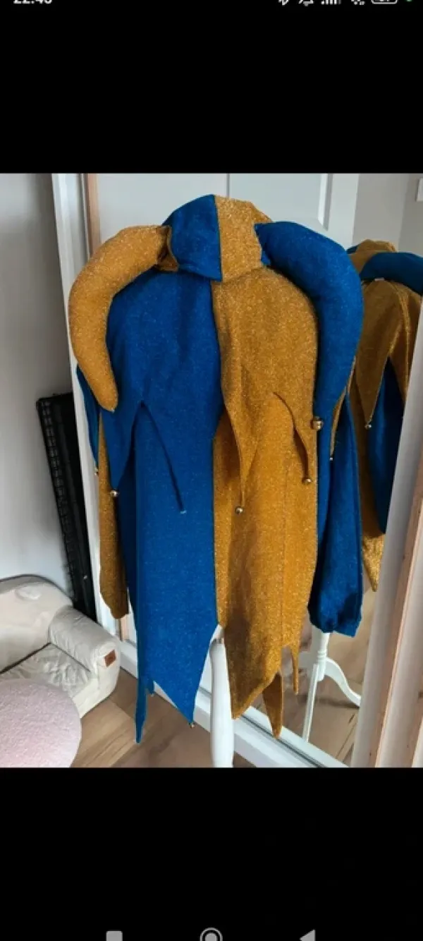 Przebranie karnawałowe błazen. Zestaw góra,kołnierz i czapka. W kołnierzu brak paru dzwonków. Rozmiar uniwersalny.