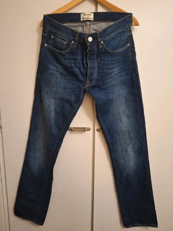 Siniset Acne Studios farkut 32/32. Tiukka malli joka ei jousta. Vyötärö n. 41,5 cm ja pituus 106 cm. Malli Roc Verakai. Suorat lahkeet mutta slim malli. Ei mahdu päälle joten katso netistä mallikuvat 🙂