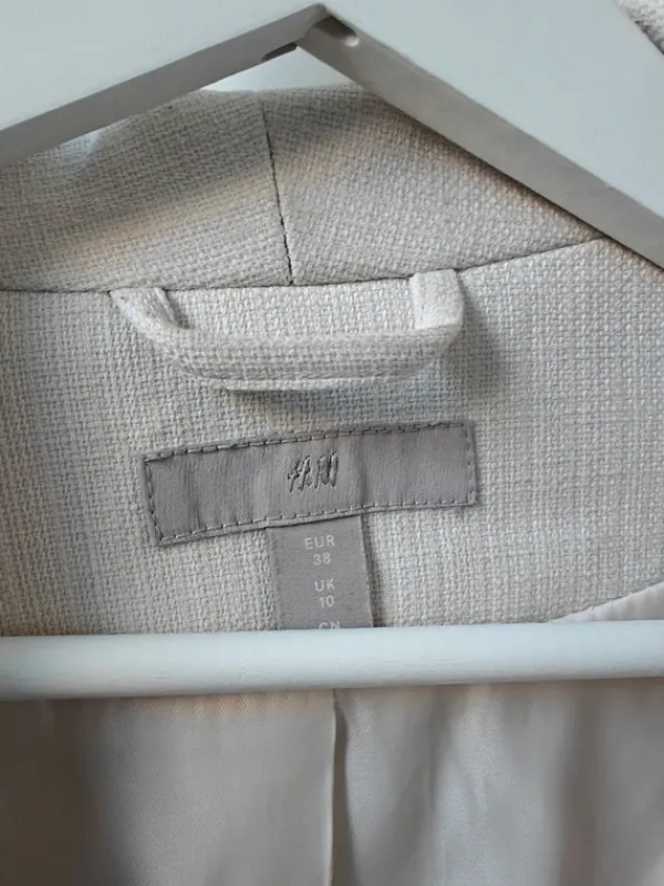 Vaalean beige bleiseri, hihat rypytetty 3/4 osa hihoiksi.