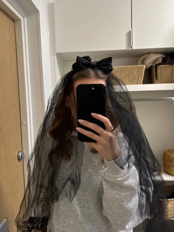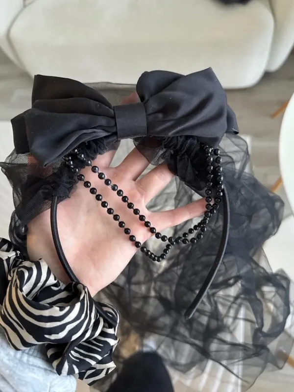 Musta huntu, joka kiinnitetty rusettipantaan. Pannassa kiinni myös helminauha, jonka saa etu- tai takapuolelle. Alunperin lastenosastolta, joten menee myös lapsen päähän. Panta on joustava. Kerran käytetty.