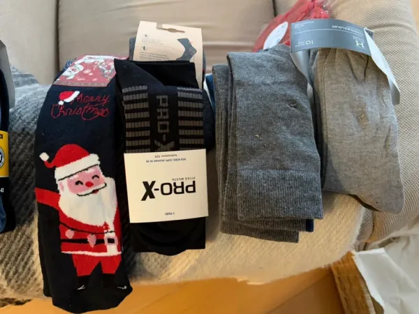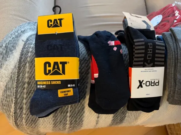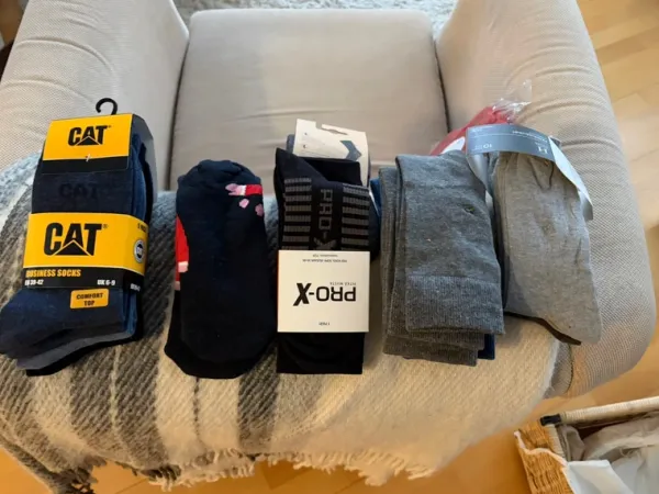 Myyntiin uusia miesten sukkia. 13 paria ja yhdet joulusukat ja kahdet pro x sukat