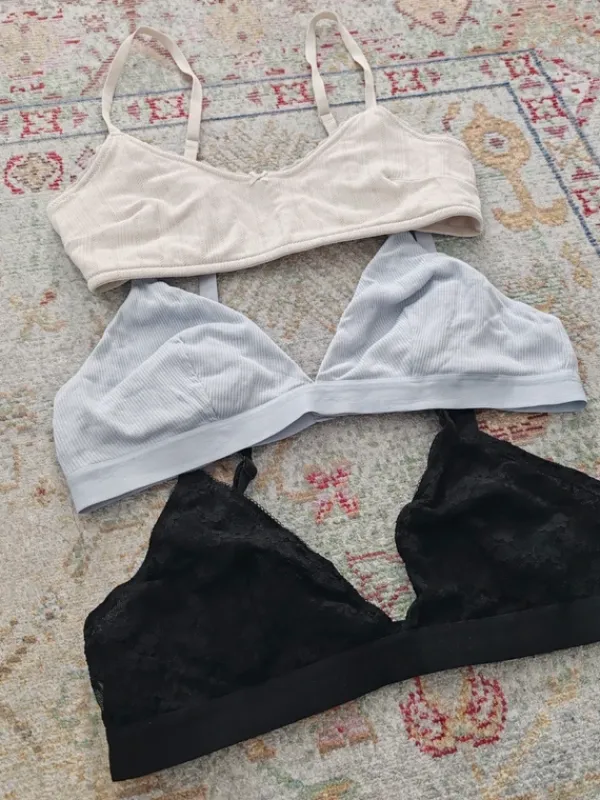 3kpl H&M vuorittomat rintaliivit. Koko L. Siistiä ja ehjiä, valkoisia käytetty jonkun verran, sinisiä kerran ja mustia ei ollenkaan. Valkoisista puuttuu pehmustekupit. Säädettävät olkaimet.Valkoiset ja siniset 95% puuvillaa.