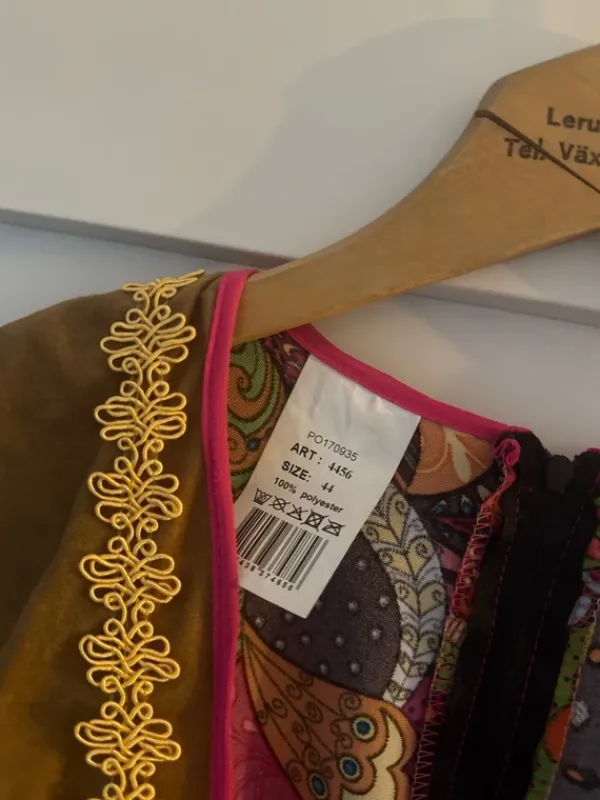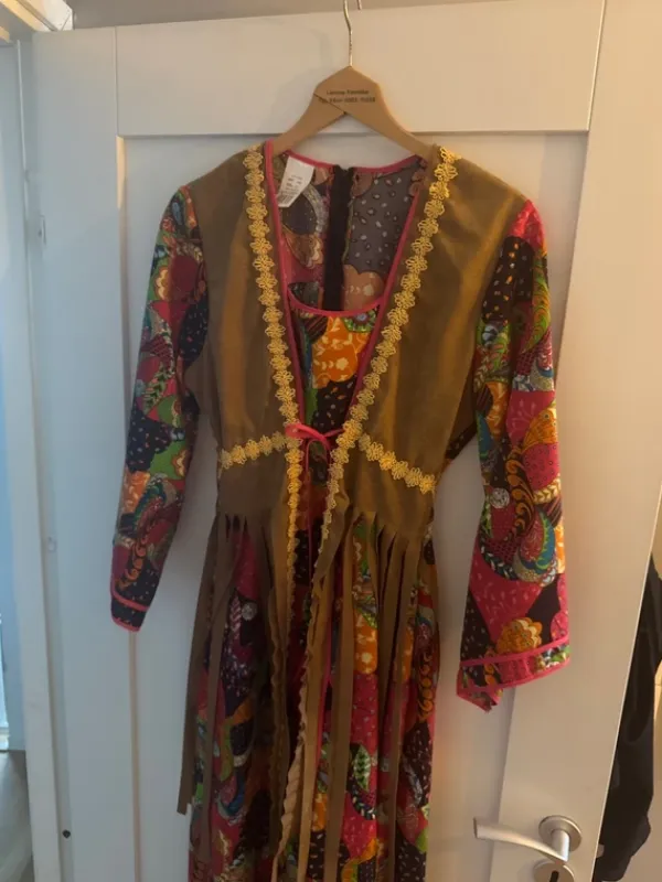 Färgglad 70-tals klänning för maskerad med påsydd brun fransväst. Strl 44, men skulle säga mer en strl 40-42/Large. Använd en gång.