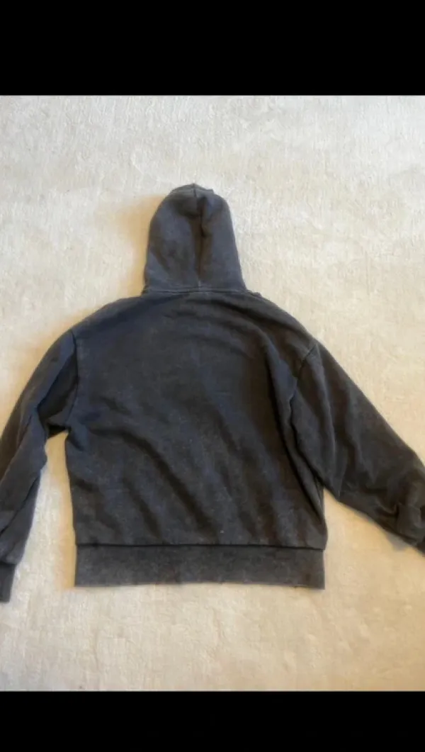 Bershkasta ostettu tumman harmaa ”washed” tyylin huppari, reunat on hieman rikottu (kuuluutyyllin, nakyy vikassa kuvassa). Miesten S, käy naisille S ja M