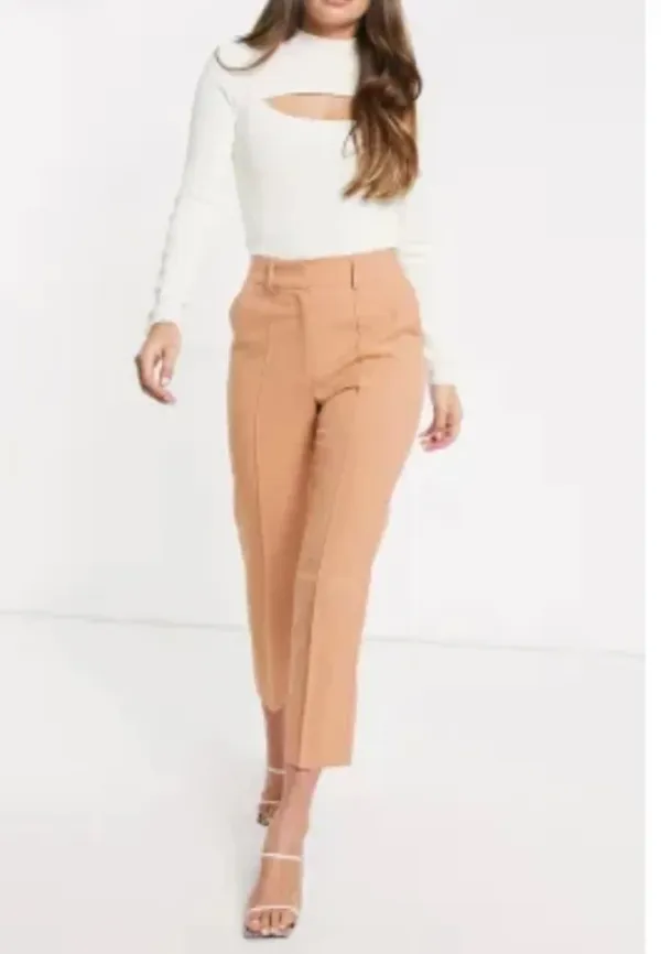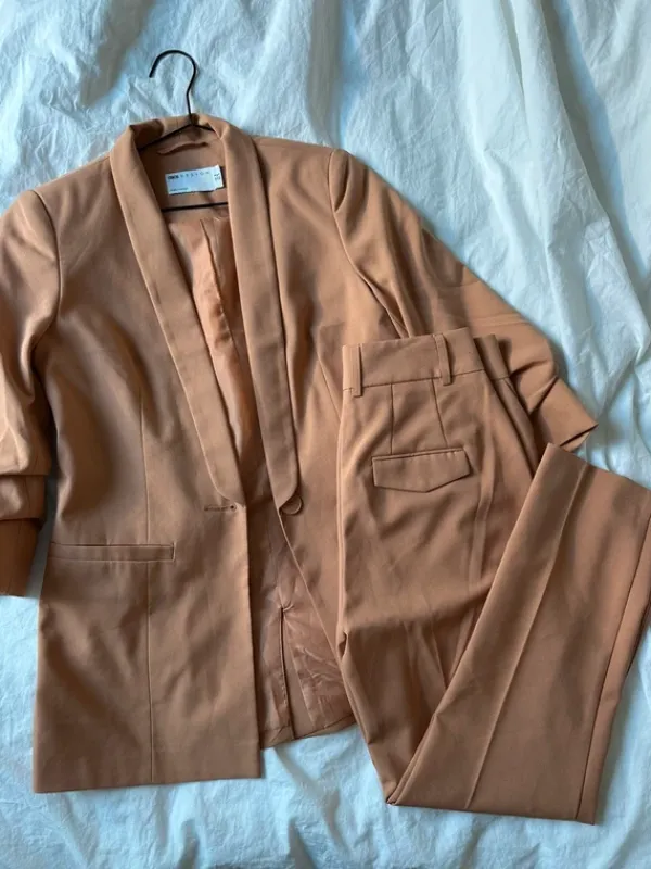 Kaunis persikan värinen bleiseriasu. 🧡 Housut kokoa 34 ja bleiseri rypytettyillä hihoilla koko 36. Ollut hyvä 161 cm pituiselle. Viimeisessä kuvassa näkyy väri kirkkaassa valaistuksessa.