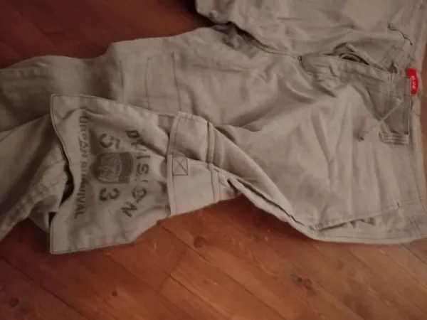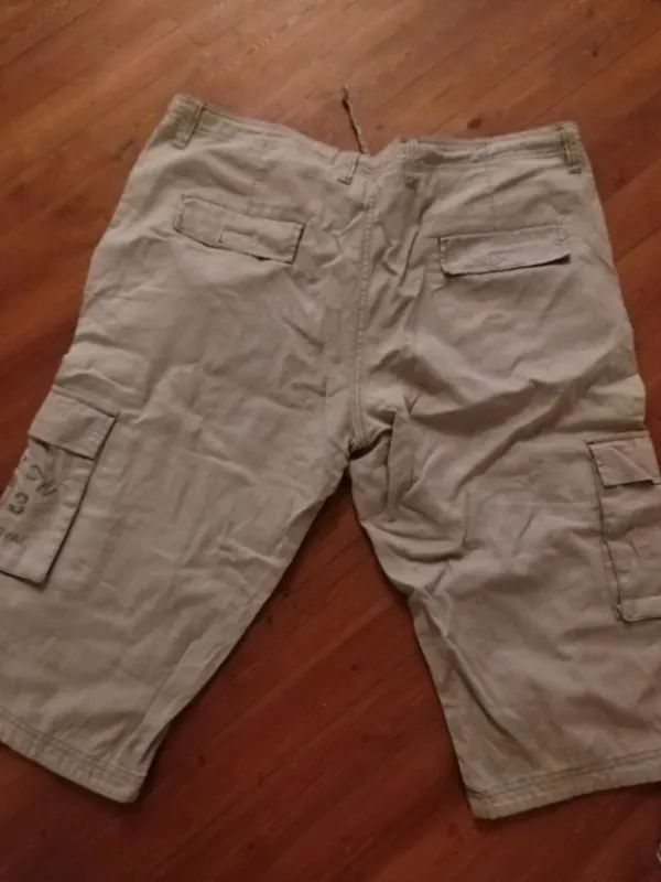 Miesten shortsit. Puuvilla/pellava sekoite. Vastaa kokoaan. Väri khaki. Noin polvi pituiset.