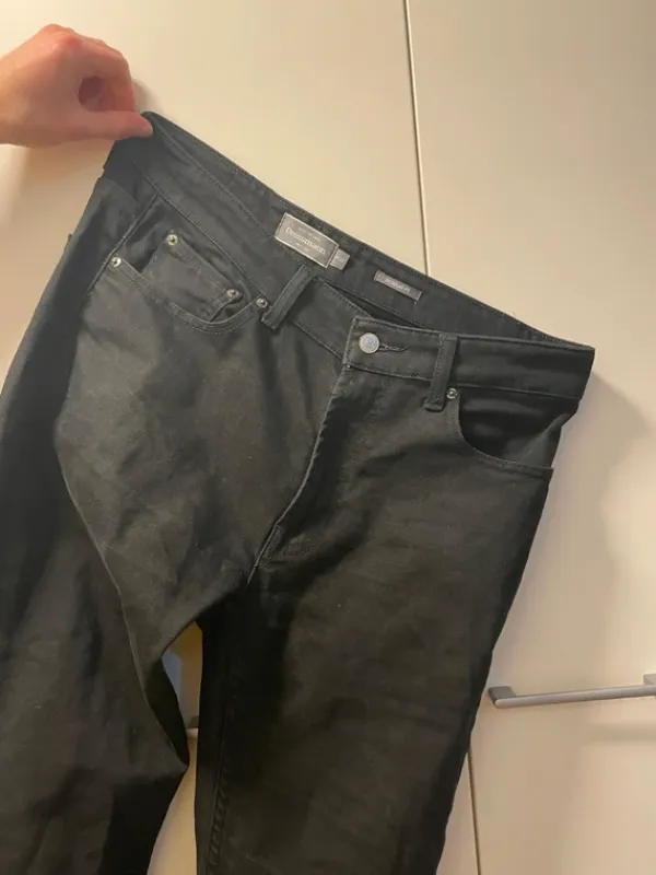 Farkut Dressmann regular fit.Farkkujen leveys 32, pituus 34.Olen 190cm pitkä ja painan 88kg. Nämä farkut ovat hieman kireät.