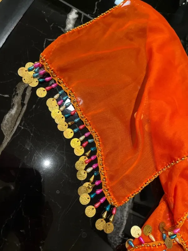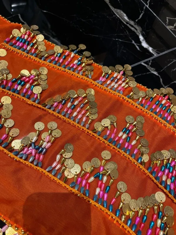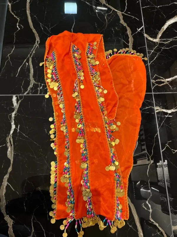 Oranssia ohutta kangasta oleva napatanssi vyö kultaisilla ja kirjavilla helmikoristeilla.
