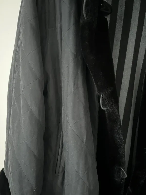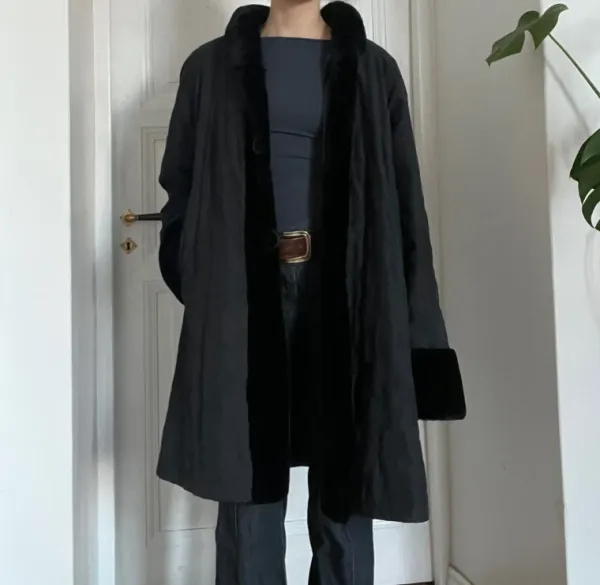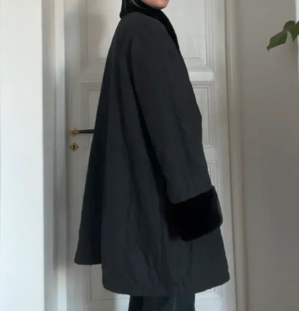 Sleek black oversize coat with plush faux fur collar, cuffs and a single button closure.•Length from shoulder to hem 95cm•Sleeve length from shoulder 75cm•Shoulder to shoulder 45cm#vintagecoat #fauxfur #oldmoney #winterfashion #coquette #wintercoat #furcoat #vintagejacket #longcoat #longjacket #longvintagecoat