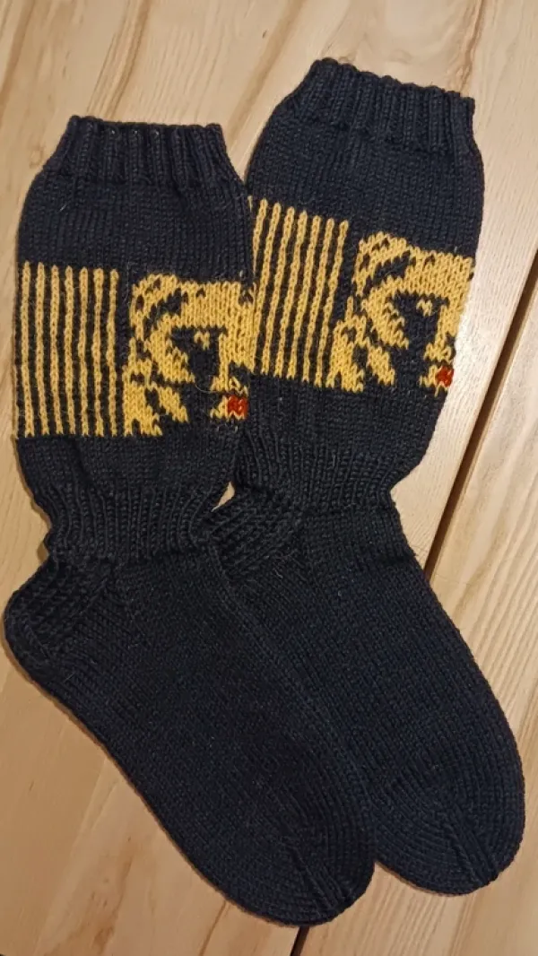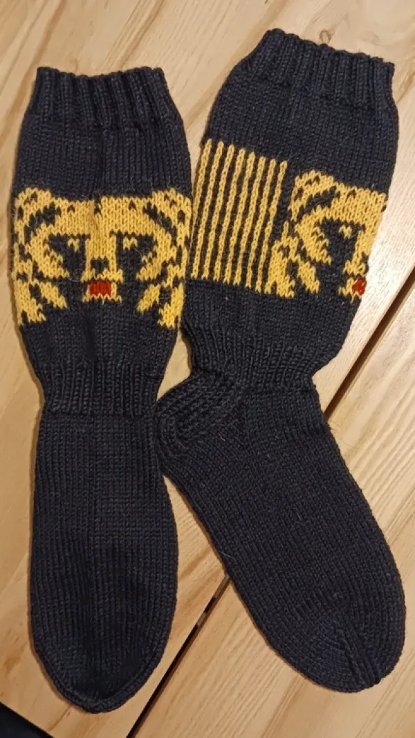 Uudet, itsekudotut villasukat. Lanka Kotikulta sukkalanka. Varsi 25 cm, teräosan pituus 28 cm ja ymp.mitta 24 m. Koko n. 44. Koiratalous.