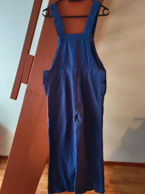 Suomalaisen (jo lopettaneen) Poola Kataryna -merkin lappuhaalari. Tosi jämäkkää kangasta, culottes -tyyppiset hieman vajaamittaiset lahkeet. Materiaalista en ole varma, kangas ei jousta ja se on melko paksua, ei kuitenkaan farkkua. Painonapit olkaimissa ja lantiolla.