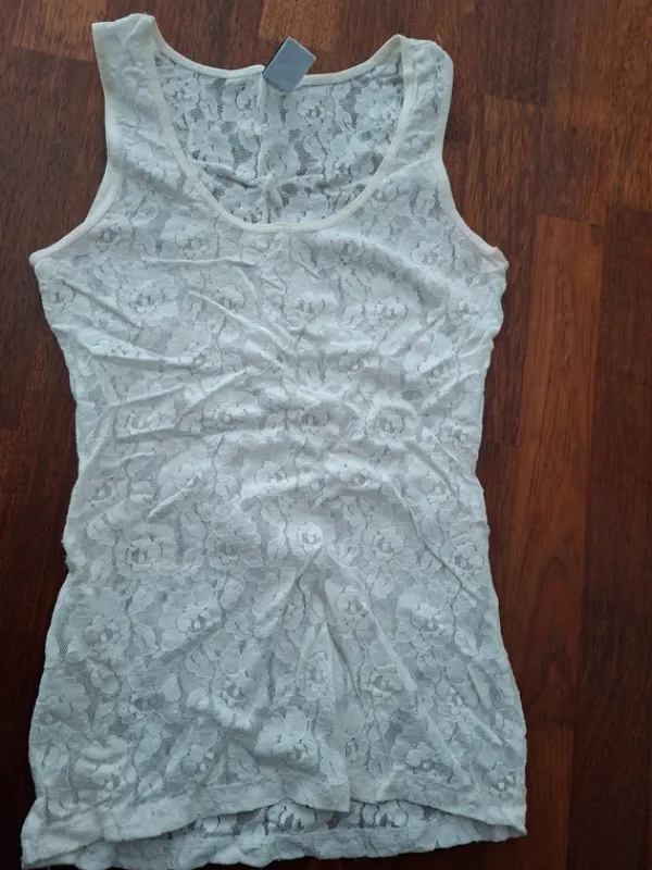 Valkoinen VeroModa pitsipaita. Koko S. Siistikuntoinen. Tarkemmassa syynissä lievää vaaleanpunertavaa väriä kainaloissa (ottanut ilmeisesti väriä jostain paidasta), mutta ei kyllä käytössä näy juurikaan.