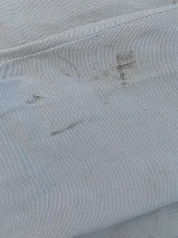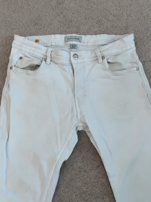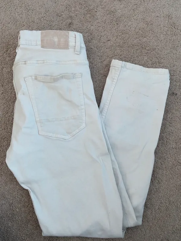 Miesten valkoiset farkut, Lahkeissa tummia jälkiä, uskon lähtevän pesussa pois. Muuten hyvässä kunnossa.