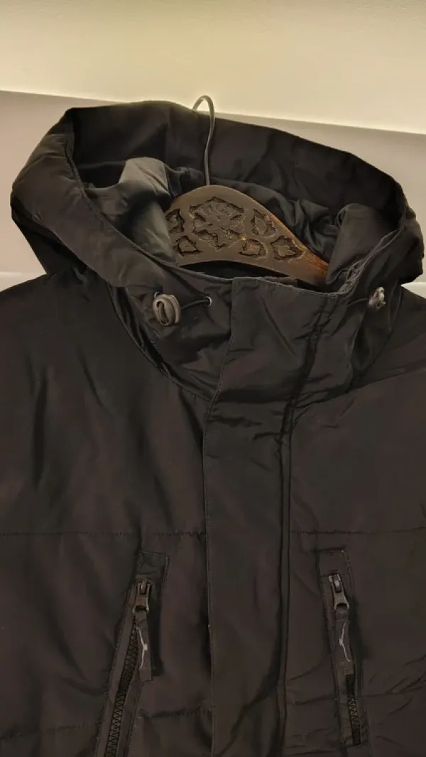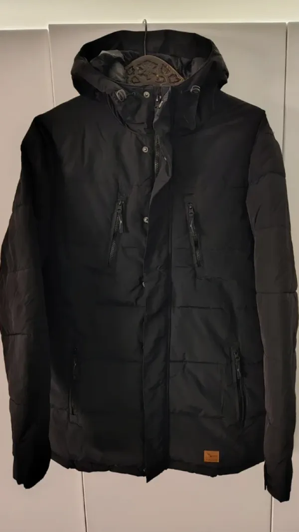 Erittäin hyväkuntoinen miesten toppatakki. Huppu, 4 vetoketjutaskua, hiharesorit.