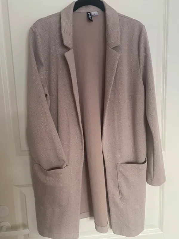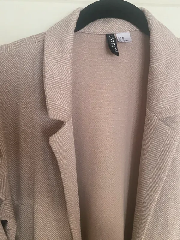 Hm kankainen bleiseri, miellyttävä liikkuva materiaali. Pituus noin reisiin. Eläimetön, savuton talous. Pieni langannousu huomaamattomassa paikassa, muuten siisti ja ehjä.Koko vastaa M