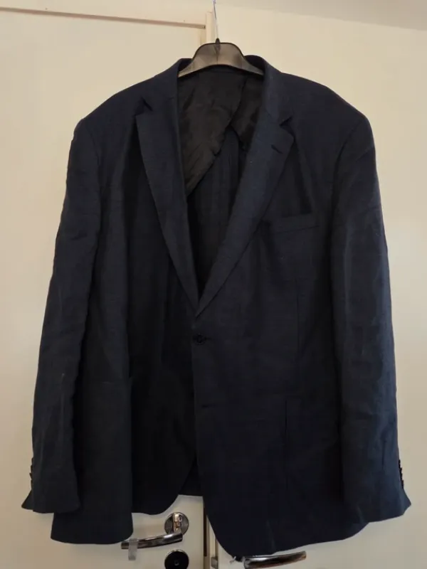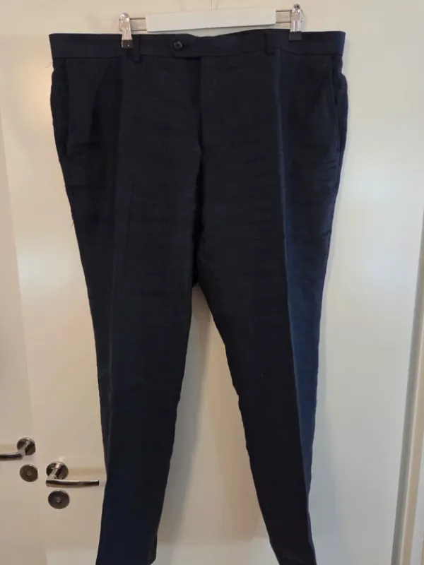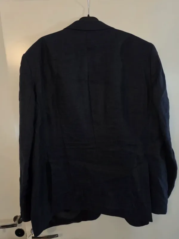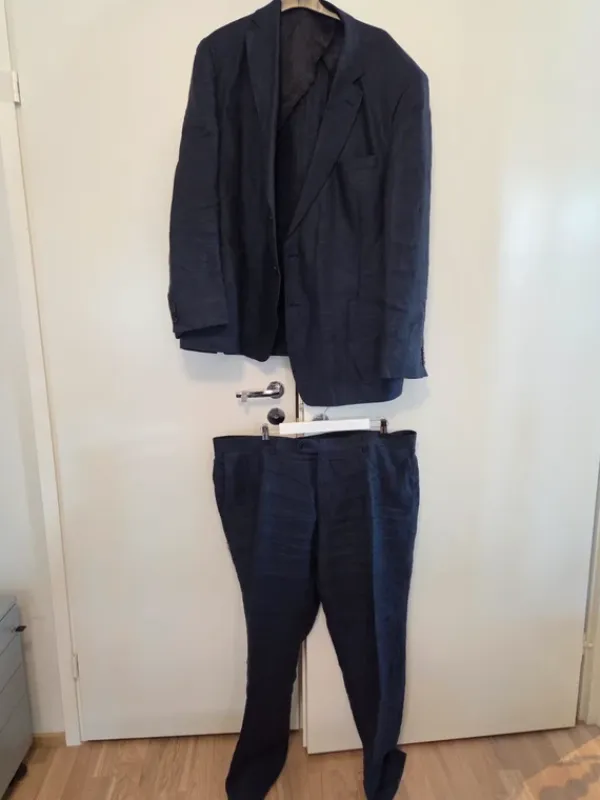 Kerran käytetty Dressmann tumman sininen pellavapuku. Takki kokoa 62, housut 40/32.