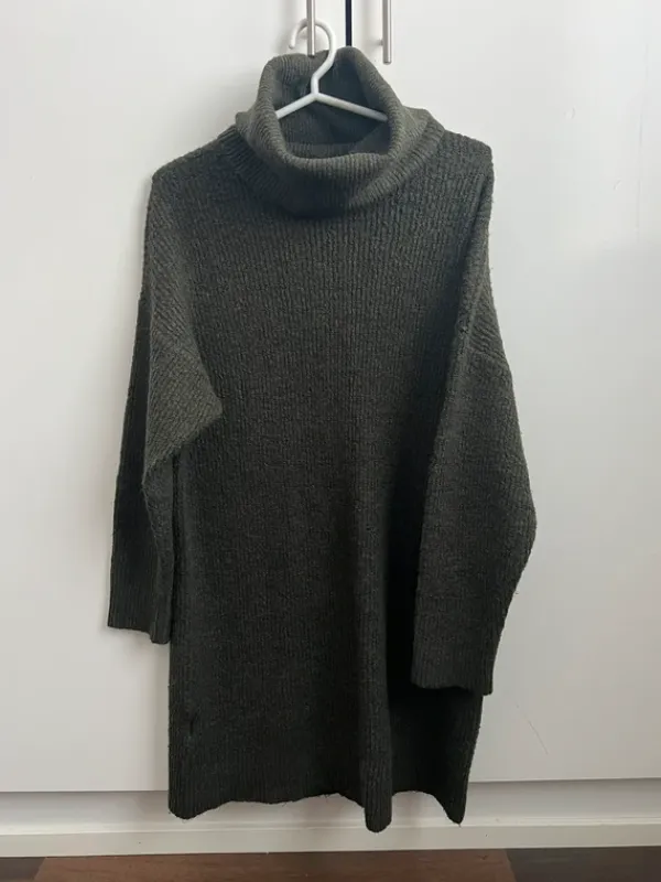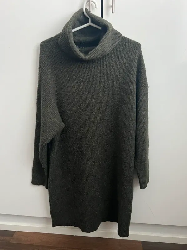 Vihreä lämmin ribattu poolokaulusneulemekko. Nukkaa paikkapaikoin pinnassa. Koko = 36, mutta menee hyvin myös 38 käyttävälle.