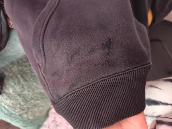 Etutaskussa kangas kulunut mutta ei reikää. Hihansuut kuluneet.Muuten siisti ja ehjä.