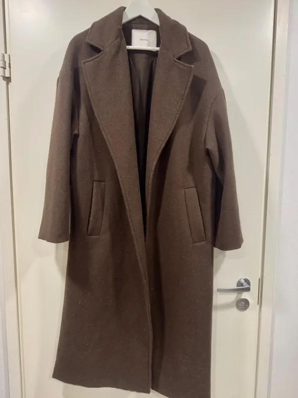 Pitkä ruskea villakangastakki. Toisessa taskussa pieni reikä ja takkiin tarttunut karvoja. Koko M, mutta on oversized.