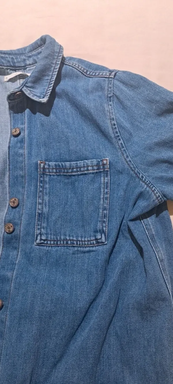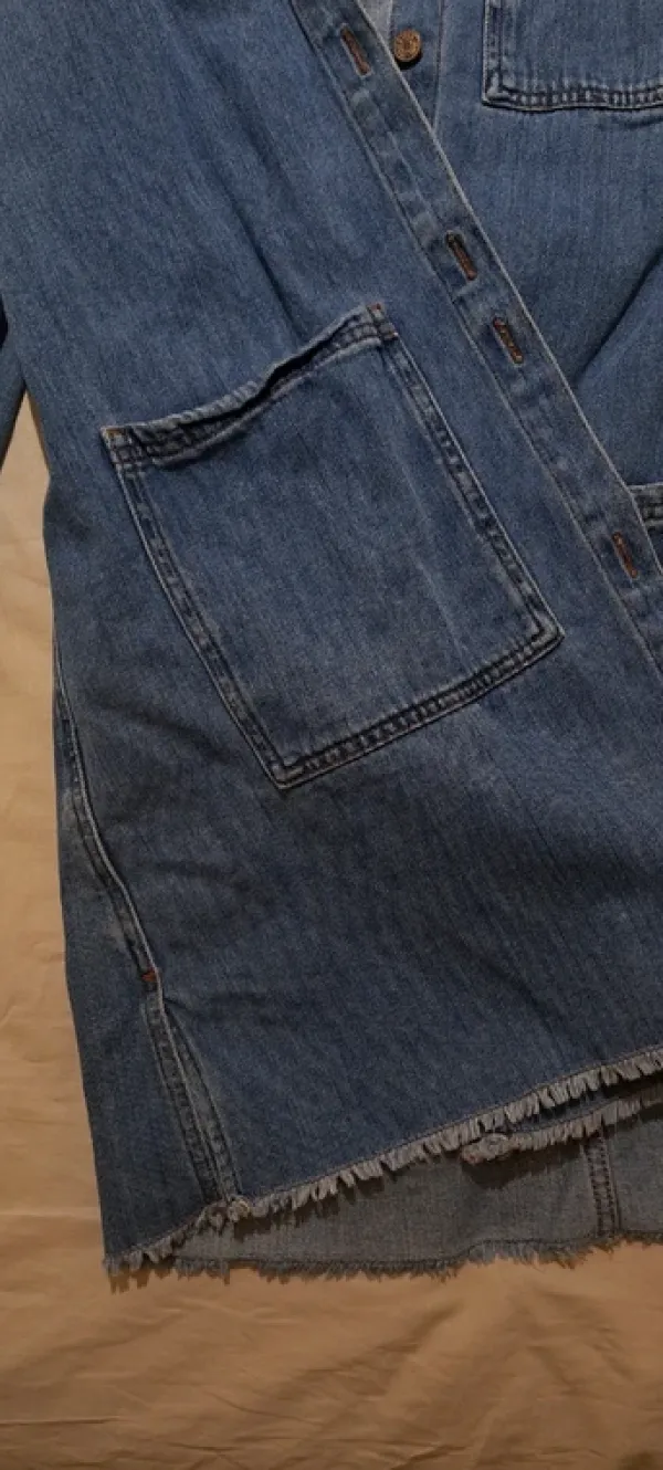 Mangon puolipitkä farkkutakki, taskut, napitus ja alareunassa pientä hapsua. Siistissä kunnossa.