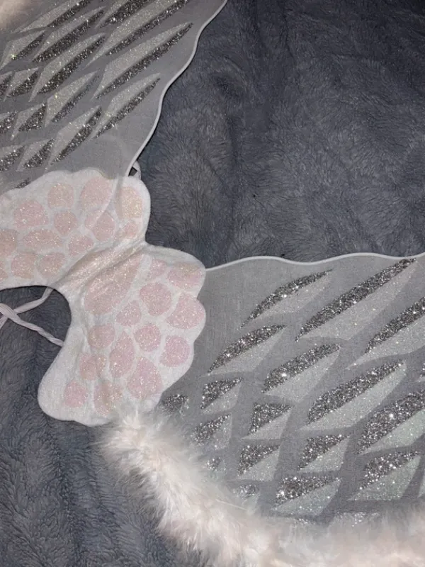Enkelin siivet sekä sädekehä. Kerran käytetty omasta toimesta, ostettu aiemmin vintedistä. Siivissä glitteriä. Ei käytönjälkiä. Siipien koko ei tiedossa, mutta sopii ainakin S kokoiselle.