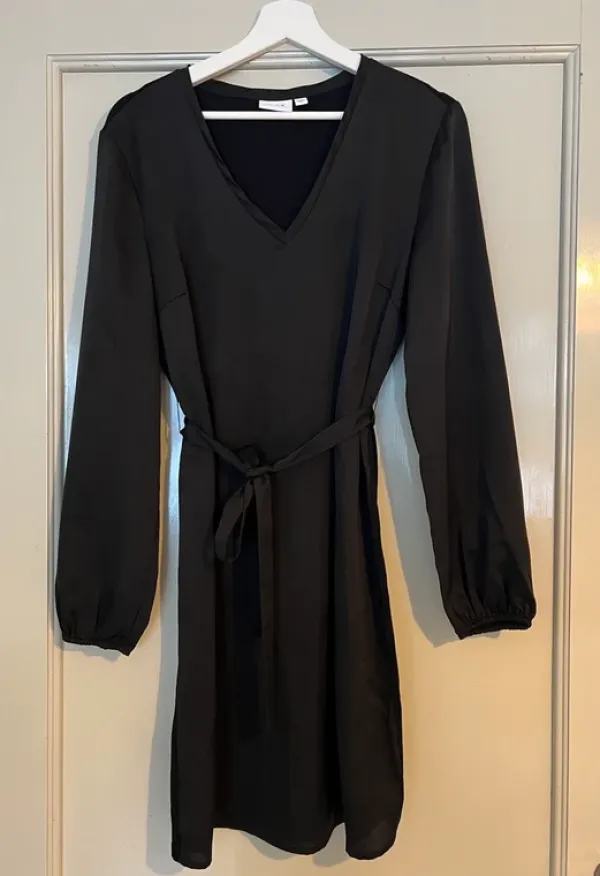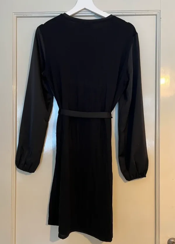 Musta pitkähihainen mekko solmittavalla vyöllä. Hihoissa on pienet kiristykset ja kaula-aukko on v-aukko. Kerran käytetty.
