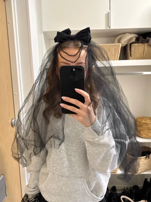 Musta huntu, joka kiinnitetty rusettipantaan. Pannassa kiinni myös helminauha, jonka saa etu- tai takapuolelle. Alunperin lastenosastolta, joten menee myös lapsen päähän. Panta on joustava. Kerran käytetty.