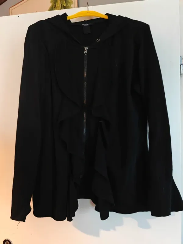 Musta huppari, jossa edessä koriste”liuhukkeet”. Joustaa hieman.
