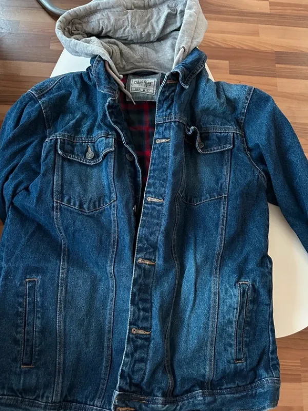 Myynnissä Pull&Bearin farkkutakki, jossa irrotettava harmaa huppu. Klassinen ja ajaton malli, helppo yhdistää moniin asuihin. Koko L-XL