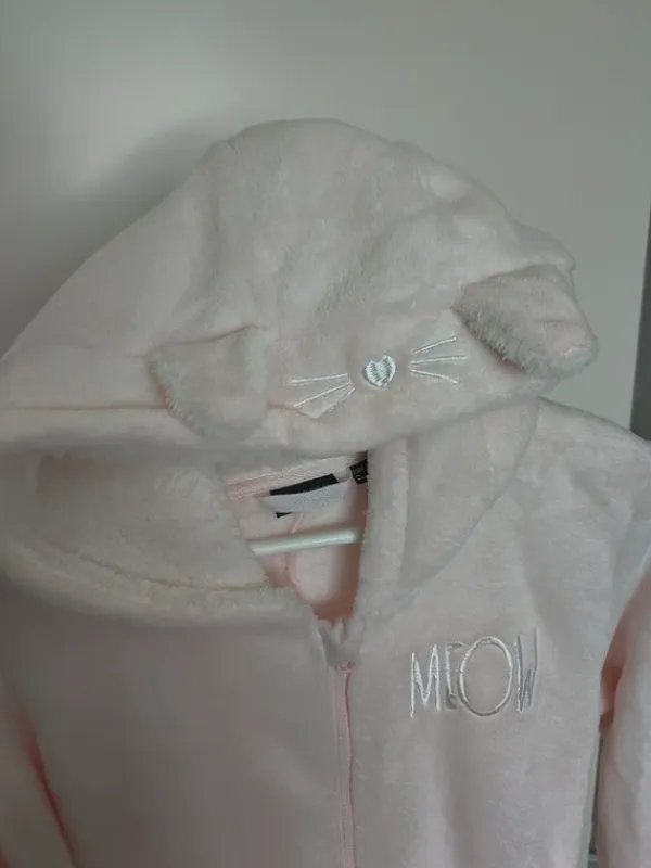 Koon M vaaleanpunainen haalari/oloasu. Vetoketju ja vyötäröllä kiristysnauha. Taskullinen. Hupussa kissankorvat. Lähes käyttämätön.