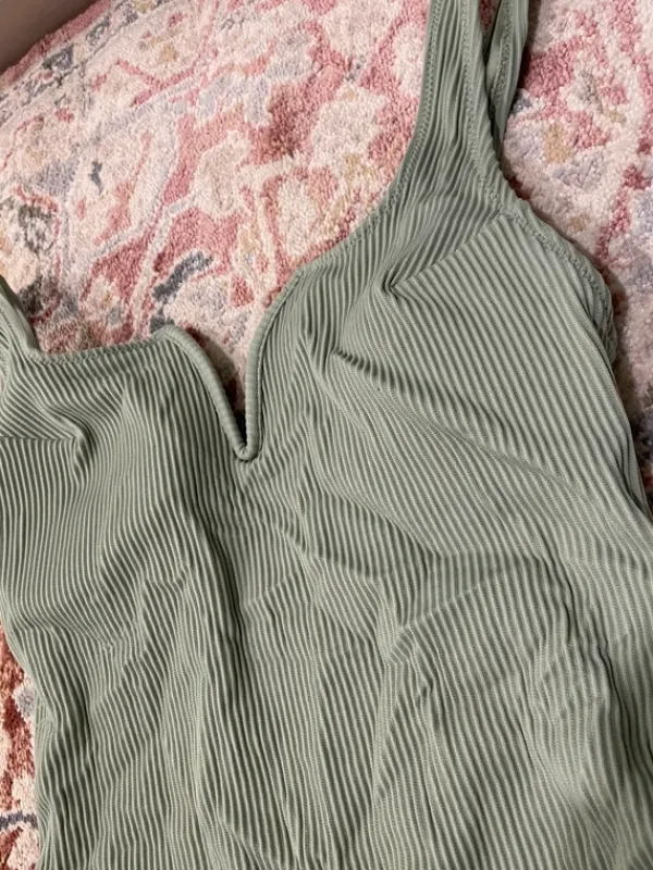 Vihreä uimapuku, kaarituet ja toppaukset löytyy. Kokolappu irroitettu mutta on muistaakseni 36. Ei juurikaan käytön jälkiä.