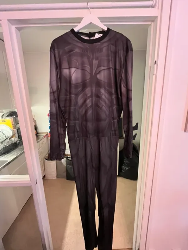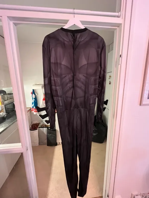Batman-dräkt från Funidelia, köpt för 399kr. Storlek XL, upplevs ”true-to-size”.