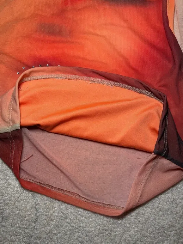 Yläosasta epäsymmetrinen paita, kerran ollut päällä. Mesh kangasta, edessä lisäkangas. Sanoisin kooksi XS/pieni S. Langanpurkaumia sisäsaumoissa.