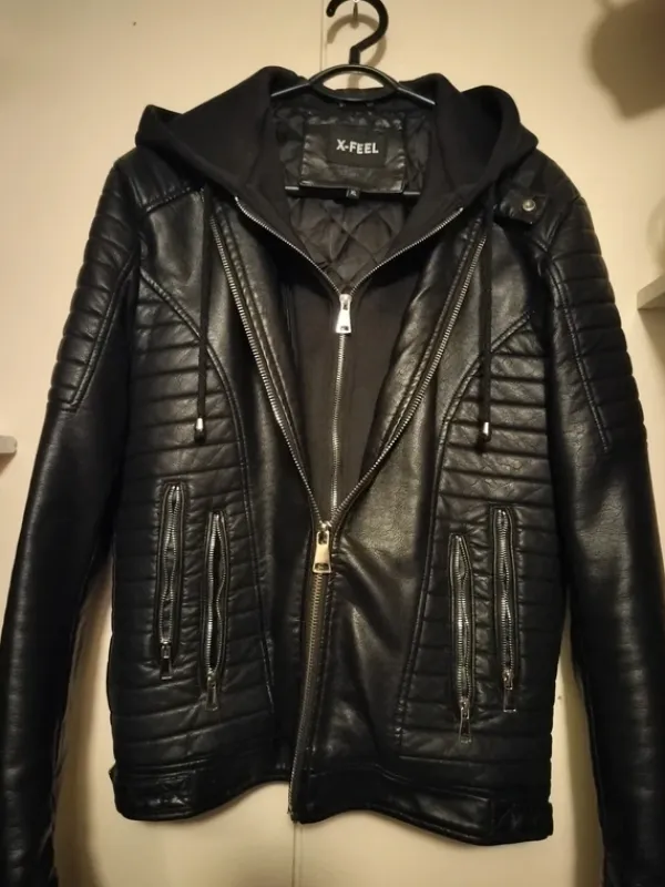 Unisex malli, pehmeä, kivan tuntuinen keinonahkatakki. Huppuosan saa vetoketjulla irti, vetoketjut myös taskuissa ja hihoissa.