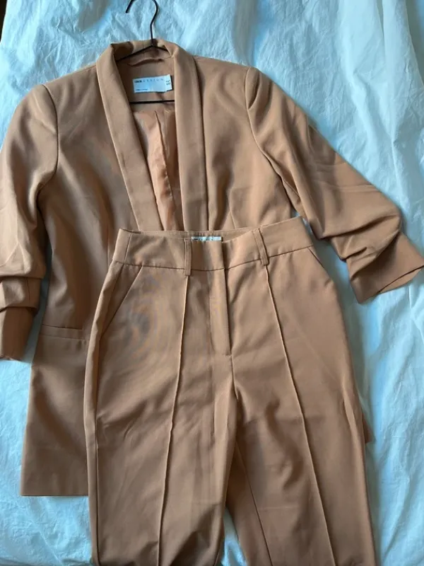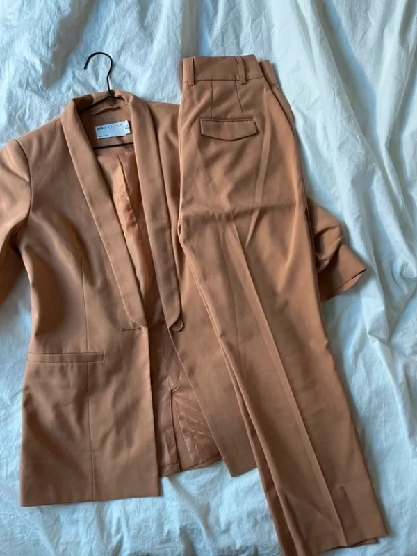 Kaunis persikan värinen bleiseriasu. 🧡 Housut kokoa 34 ja bleiseri rypytettyillä hihoilla koko 36. Ollut hyvä 161 cm pituiselle. Viimeisessä kuvassa näkyy väri kirkkaassa valaistuksessa.