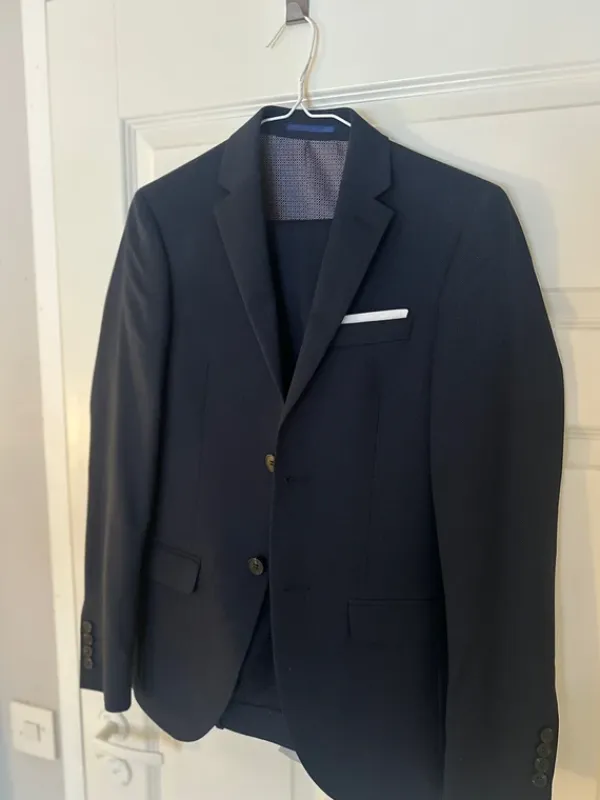 Miesten upea tummansinine puku.Koko 42. (XS) Slimfit.Kerran käytetty rippijuhlissa.