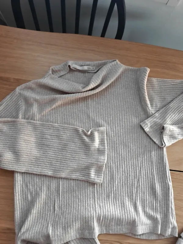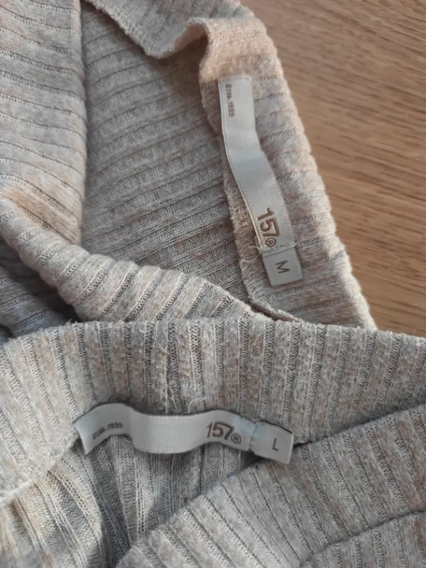Lager 157 beige oloasu. Leveälahkeiset housut koko L ja paita koko M. Suht joustava kangas, menee hyvin L koossa.