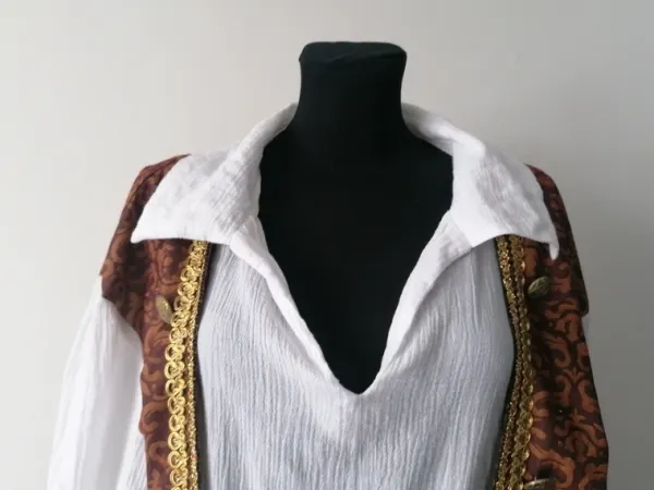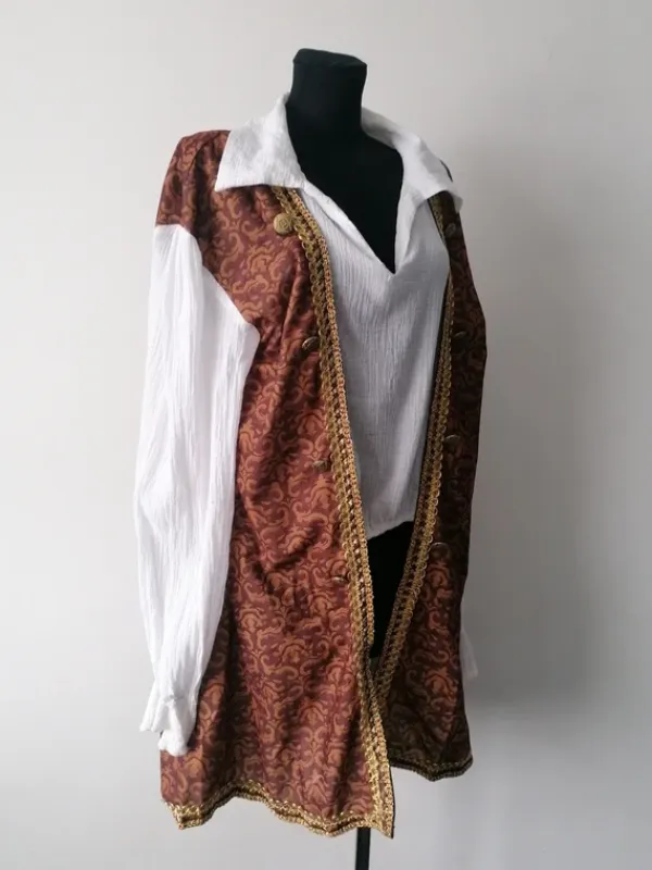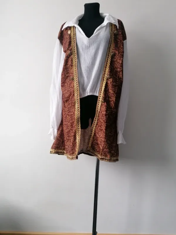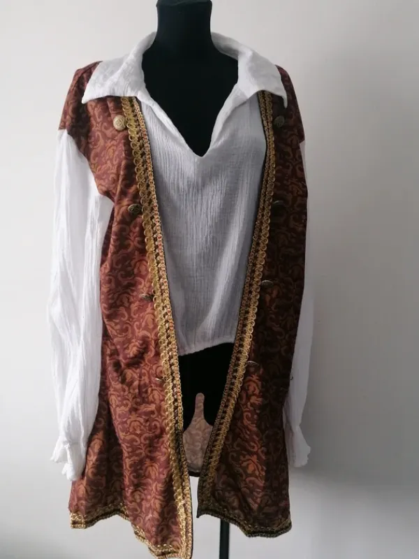 Góra stroju przebrania szlachcica dworzaninaStan bez wadRozmiar z metki MWymiary na płasko:*ramiona 59cm*pachy 63cm*rękaw mietzony od pachy 50cm*długość koszuli 48cm całości 89cm
