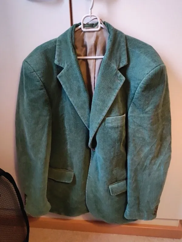itse vihreäksi värjätty takki, suht. paksu. ei löytynyt kokolappua, mutta noin M kokoinen.
