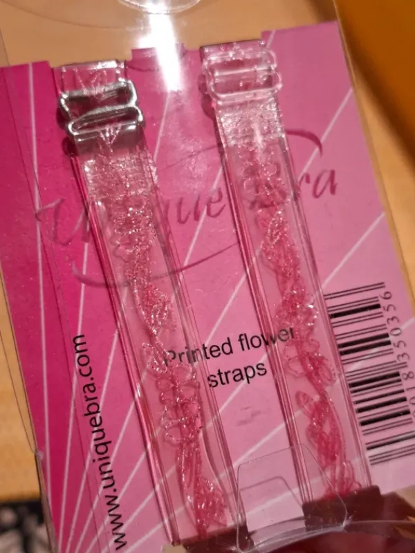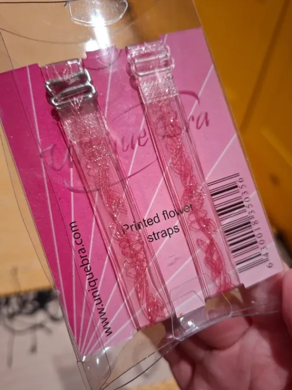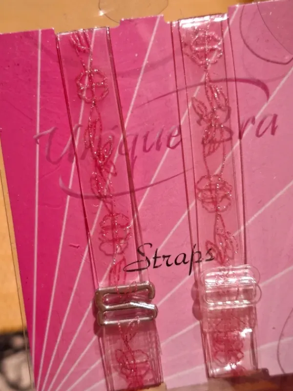 2000-luvun alussa omina nuoruusvuosina ostetut rintsikoiden irrotettavat olkaimet. Muistaakseni Seppälästä. Pakkauksen perusteella läpinäkyvät ja niissä on pinkkiä/glittermäistä kuviointia. Ei tullut ikinä avattua pakkausta, joten kaikki nämä vuodet olleet näin.