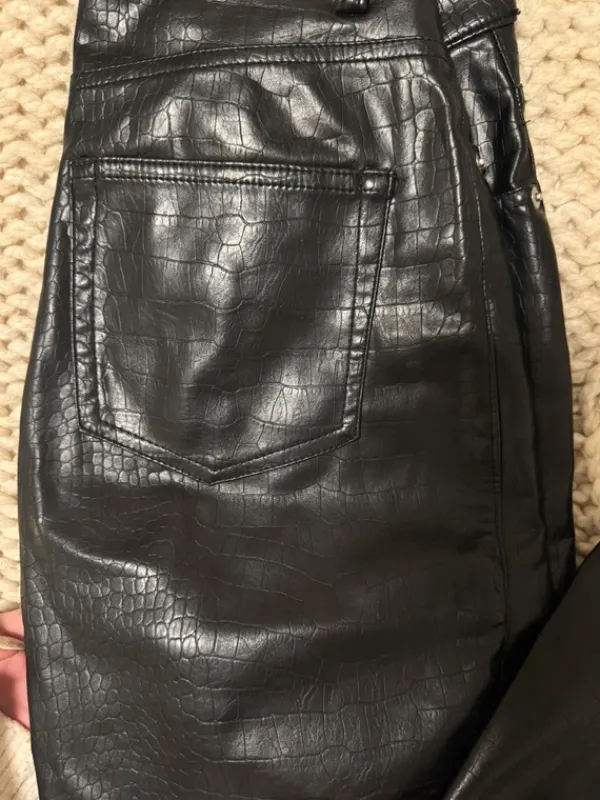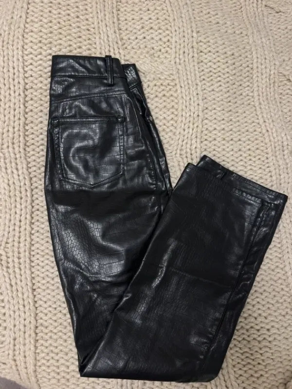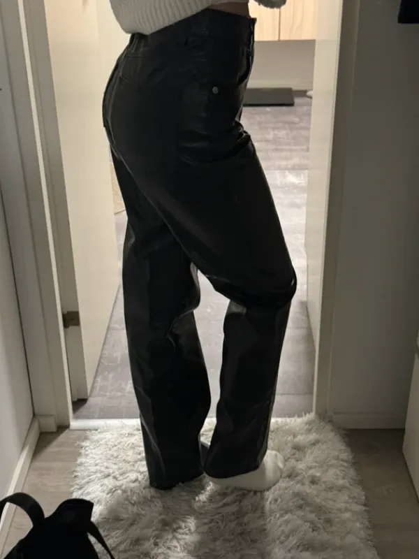 36 (S) koon mustat keinonahkahousut, kuvassa 4 näkyy kuosi. Käytetty todella vähän eli kunto hyvä! Sanoisin että sopii hyvin XS-S kokoiselle.