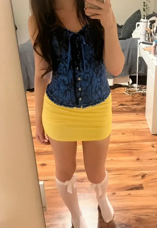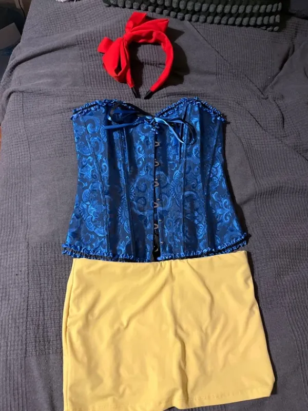Lumikki-asu erinomaisessa kunnossa. Pakkaukseen sisältyy sininen korsetti, keltainen minihame ja punainen panta🫶🏻