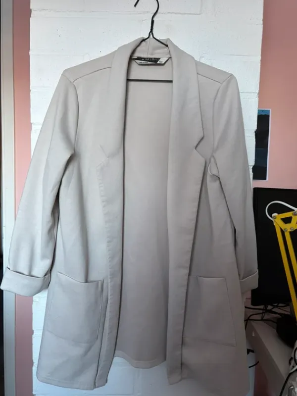 Amisu merkkinen beige bleiseri, 3/4 hihat, jotain collegen tyylistä kangastaKissatalous