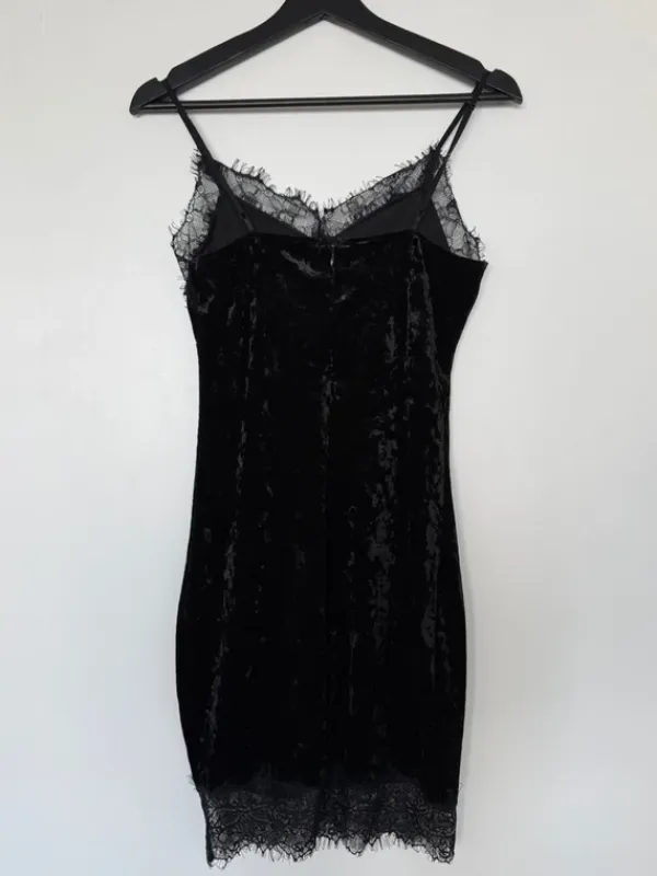 Musta samettinen bodycon mekko, jossa pieni vetoketju selässä ja säädettävät spagettiolkaimet.Pitsi ylä- sekä alareunassa.