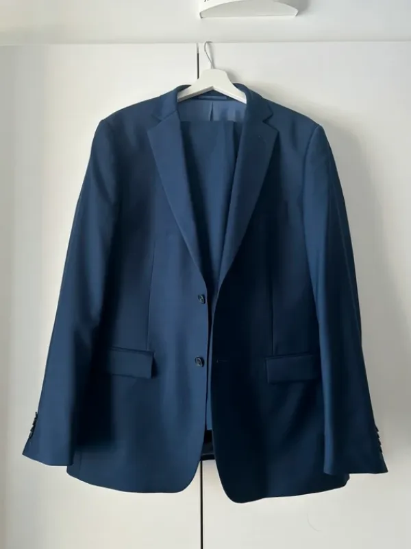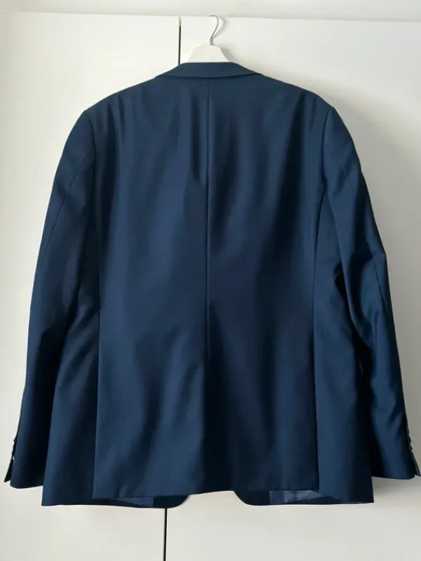 Miesten tummansininen Dressmann puku. Pidetty pari kertaa päällä. Takin koko 52. Housut 34/32. Lisää kuvia pyytämällä.