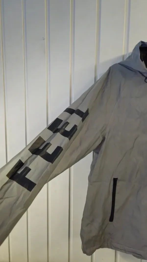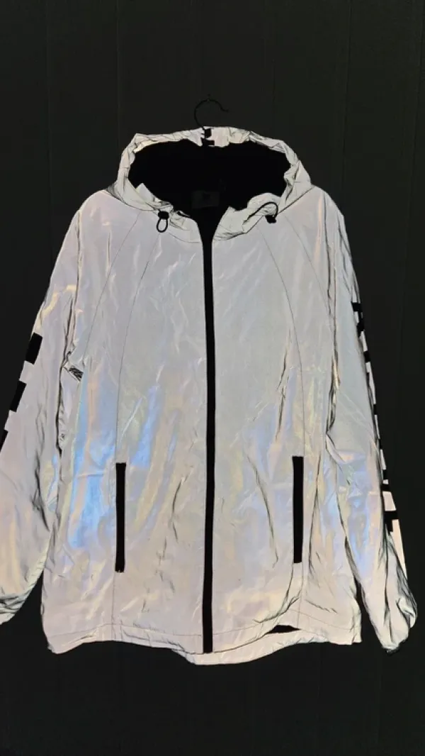 Tuulitakki heijastinkangasta, hylkii vettä. Unisex koko L. Hihoissa tekstit ”feel active”. Toisessa hihassa vähän valkoista maalia.