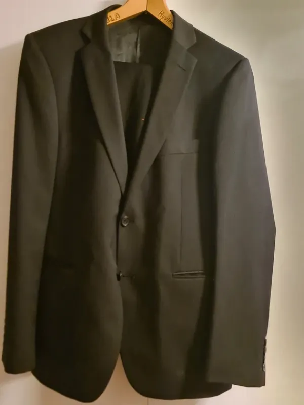 Hyväkuntoinen juhlapuku. Takki regular 50 ja housut 33/32.45% villaa takissa.