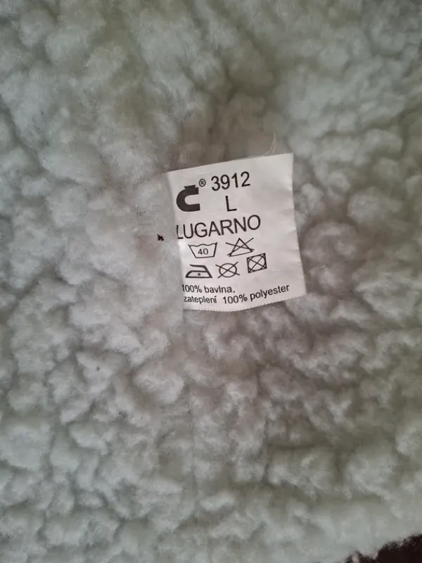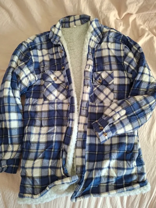 Paksu flanellitakki teddyvuorella. Kokomerkintä L. Ei tietoa merkistä.Miesten