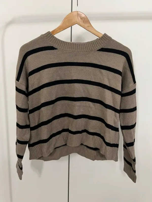 Naisten paitapaketti. Harmaa cropattu collegepaita koko M. Ruskea cropattu collegepaita koko M. Ruskea neuleliivi koko M. Beige raidallinen neulepaita koko XS, mutta on oversize. Carlings, shein, lager157, shein