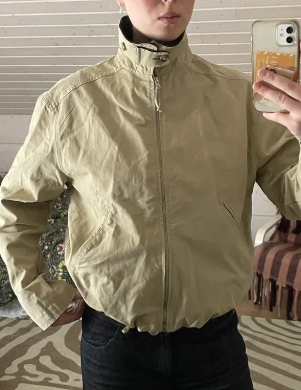 Vaalea kevyt takki. Tummat kaulukset, jotka saa nostettua korkeaksi kaulukseksi. Koko M. Olen itse 184cm.